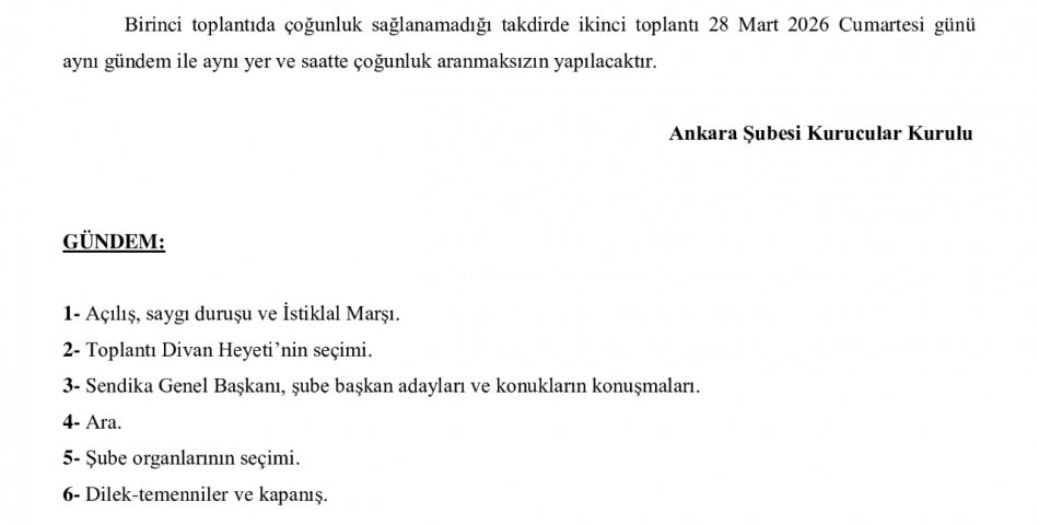ANKARA ŞUBE 1. OLAĞAN GENEL KURULU GÜNDEMİ VE ÜYE LİSTESİ İLANI