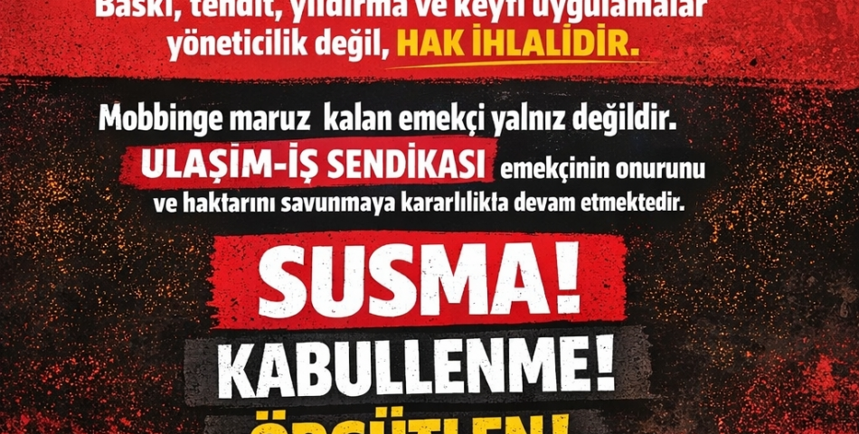 Bayrağımıza Uzanan Eller Karşısında Susmayacağız! Türk milletinin bağımsızlığının, onurunun ve egemenliğinin simgesi olan şanlı bayrağımıza uzanan elleri şiddetle kınıyoruz. Bayrağımıza yönelik her türlü saldırı, yalnızca bir bez parçasına değil; bu topraklar için can veren şehitlerimizin hatırasına, milletimizin ortak değerlerine ve geleceğine yapılmış açık bir saygısızlıktır. Ulaşım-İş Sendikası olarak buradan açıkça ifade ediyoruz: Bayrak bizim namusumuzdur. Ona uzanan her el, karşısında milyonların iradesini bulur. Kimden gelirse gelsin, hangi gerekçeyle yapılırsa yapılsın; bayrağımıza yönelik bu çirkin girişimler asla kabul edilemez. Emek mücadelesi verirken de, demokratik haklarımızı savunurken de kırmızı çizgimiz nettir: Vatan, bayrak ve Cumhuriyet değerleri tartışma konusu yapılamaz. Bizler; lokomotiften aprona, raydan yola, limandan havalimanına kadar bu ülkenin çarklarını döndüren emekçileriz. Alın terimizle bu ülkeye hizmet ederken, bayrağımızı başımızın üstünde taşımaya devam edeceğiz. Yetkilileri, bu tür provokatif ve bölücü girişimlere karşı kararlı ve caydırıcı adımlar atmaya davet ediyoruz. Sessizlik, cesaretlendirmektir; unutulmasın. Ulaşım-İş Sendikası olarak bir kez daha haykırıyoruz: Bayrağımıza uzanan eller kırılsın! Yaşasın bağımsız Türkiye! Yaşasın onurlu emek mücadelesi! Kamuoyuna saygıyla duyurulur. ULAŞIM-İŞ SENDİKASI Genel Merkezi