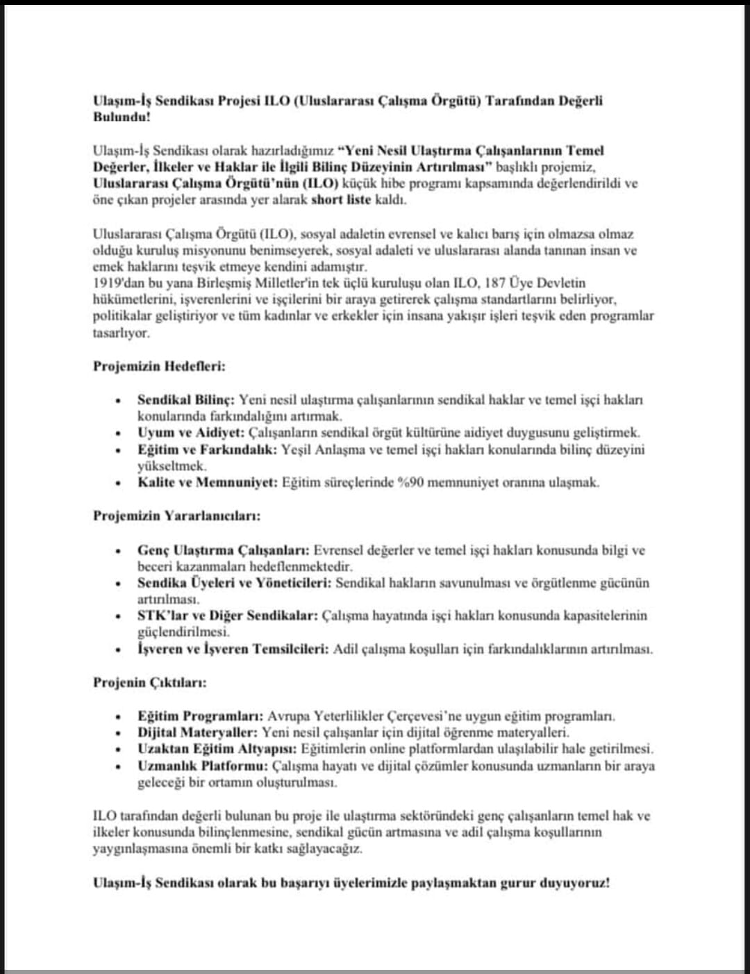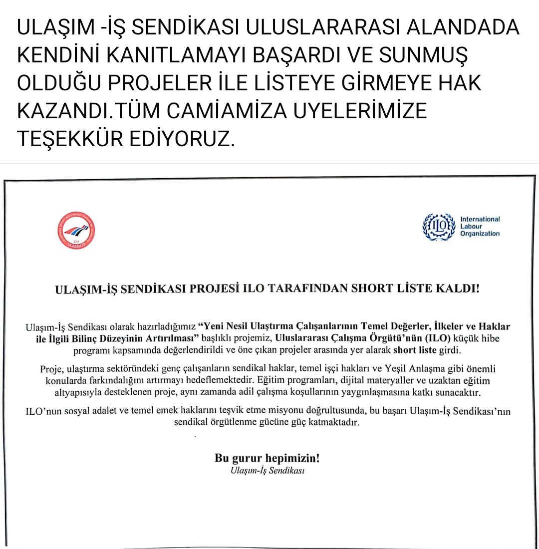 Genel Başkan Yardımcımız Çağdaş GÖRGÜLÜ'nün Girişimleri ve Katkılarıyla ULAŞIM-İŞ Sendikası Uluslararası alandada kendini kanıtlamayı başardı ve sunmuş olduğu projeler ile listeye girmeye hak kazandı.Tüm Camiamıza ÜYELERİMİZE TEŞEKKÜR EDİYORUZ.