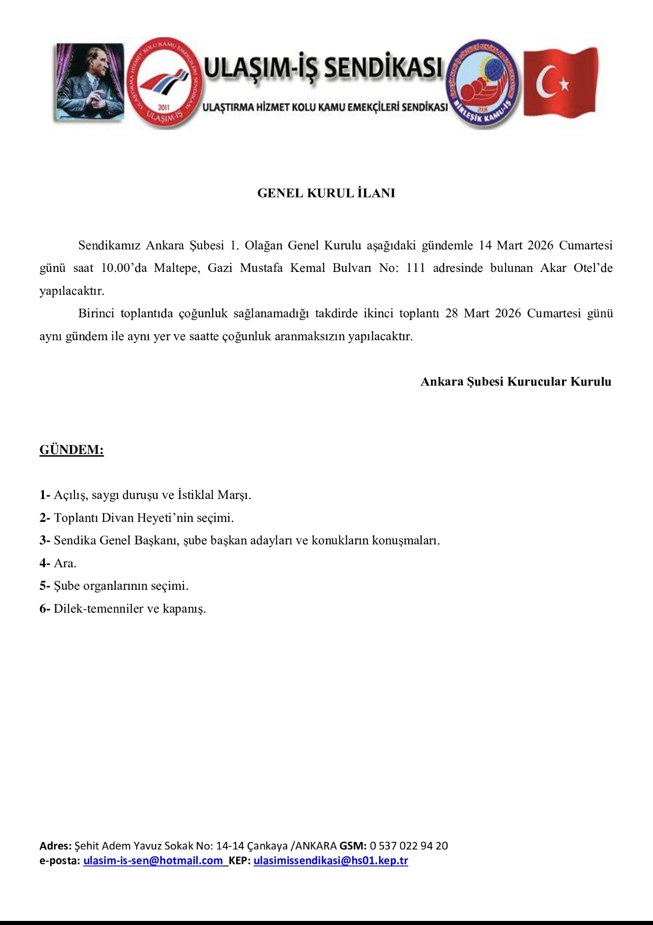 Sendikamız Ankara Şubesi 1. Olağan Genel Kurulu aşağıdaki gündemle 14 Mart 2026 Cumartesi günü saat 10.00’da Maltepe, Gazi Mustafa Kemal Bulvarı No: 111 adresinde bulunan Akar Otel’de yapılacaktır.